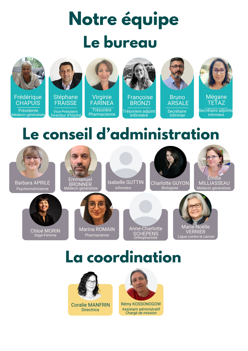 Elle est ouverte à tous les professionnels de santé de son territoire et est dirigée par une équipe dynamique :